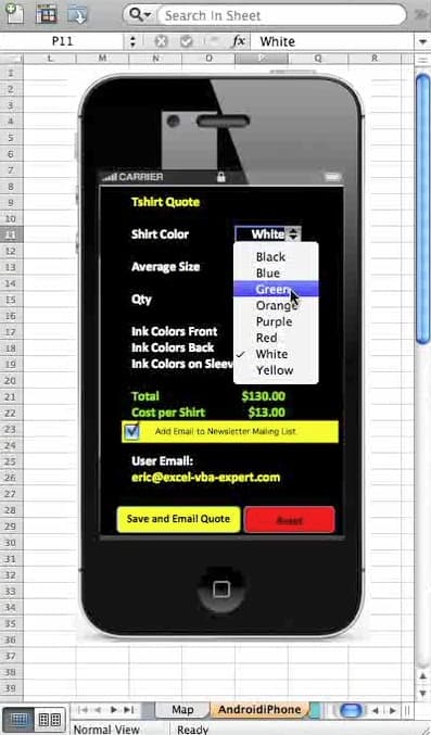 The left screen shot shows you the app calculating the total price of the job and the per shirt cost. All basic math stuff that you’d expect Excel to be good at. But the right screen shots show you Excel’s controls for pop-up menus and check boxes. All the features that allow user to feel the user interaction and user experience of the app. At this early stage the app is taking shape and testers, stakeholders and end users can run the app and comment on the user interface, functionality and the user experience.